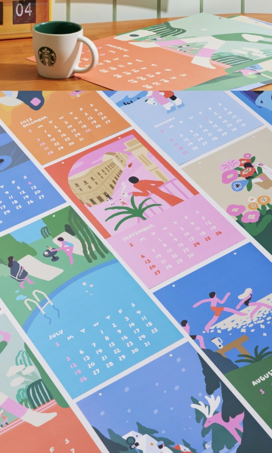 스타벅스 2026 캘린더는 뉴욕 타임즈 베스트 일러스트레이터에 선정된 오요우 작가와의 협업으로 제작되었다고 합니다. 달마다 한 장씩 뜯어 쓰는 벽걸이형이고 일러스트 스티커까지 포함되어 있어서 플래너와 함께 꾸미기에도 딱이에요.